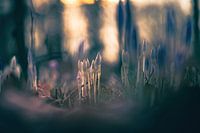 Close up van ontluikende krokussen in het zachte licht van de opkomende zon. De foto is bewerkt donkere moody tinten.