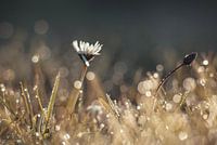 Close up van een madeliefje in het met dauwdruppels bedekte gras. Het zonlicht zorgt voor een glinsterende bokeh.