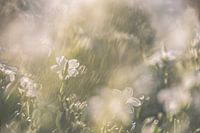 Close up van de bloesem van de Cerastium tomentosum, ofwel viltige hoornbloem. Het zonlicht schijnt over de bloemen en door het grote diafragma krijg je een schitterende bokeh.