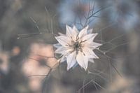 Close up van een nigella, love-in-the-mist, ofwel juffertje-in-'t groen. De foto is van bovenaf gemaakt, met een zachte bokeh achtergrond.