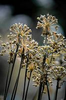 Close up van uitgebloeide Allium, ofwel sierui. De foto is in moody kleuren bewerkt, met een donkere achtergrond.