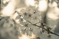 Close up van de bloesem van een prunus in het gouden licht van de opkomende zon. De foto is in monotone lichte kleuren bewerkt.