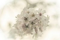 Close up van de bloesem van een prunus. De foto is in high key gemaakt, wat betekent iets overbelicht, waardoor alles in lichte tinten is.