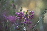Close up van de dopheide ofwel Erica cinerea, in het gouden licht van de opkomende zon. De foto is gemaakt in het arboretum van Wageningen.