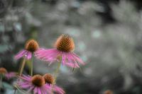 close up van roze Echinacea, ofwel zonnehoed, met dubbele belichting gefotografeerd, en met een grijze bokeh achtergrond