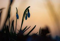 close up van sneeuwklokjes die als een silhouet afsteken tegen de oranje lucht van de bijna opkomende zon