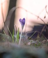 close up van een paars enkel krokusje, met op de achtergrond een warmkleurige lucht door de opkomende zon