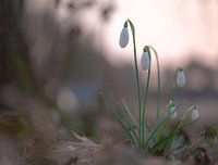 close up van een groepje sneeuwklokjes op de bosgrond, met de warmkleurige lucht door de opkomende zon op de achtergrond