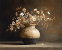 bloemen stilleven | Soft Light Arrangement - Dit bloemen schilderij toont een Japandi stilleven van een ronde, lichtgepatineerde keramische vaas met een donkere onderkant waaruit losse, witte bloesems en fijne takjes zacht uitwaaieren in warme beige en bruine tonen, een schilderij bloemen en schilderij bloemen-stilleven dat perfect past…