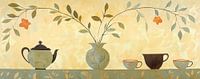 bloemen vaas - Dit bloemen schilderij toont een Japandi stilleven met in het midden een matte groene vaas vol rankende takken en twee kleine oranje bloemen en aan weerszijden een bijpassende theepot, kopjes en een donkerbruine kan op een bladertafel tegen een warme geel-beige achtergrond, een fris en modern schilderij bloemen /…