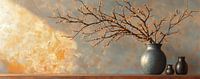 bloemen vaas - Dit bloemen schilderij is een Japandi-stilleven met een grote gespikkelde keramische vaas en lange takken vol kleine gouden bloesems naast twee kleinere vazen op een houten plank tegen een zacht blauwgrijze achtergrond met warme oranje lichtvlekken; bloemen schilderij, schilderij bloemen.