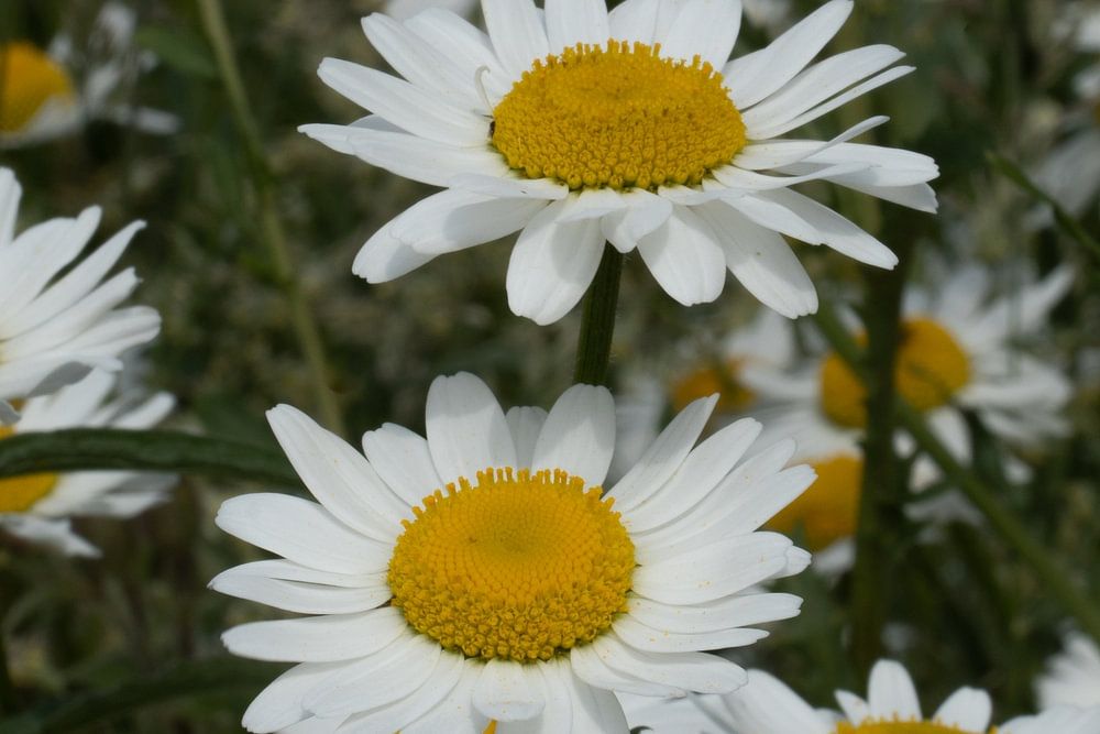 Wilde witte bloemen velden. Witte bloemen met gele harten.