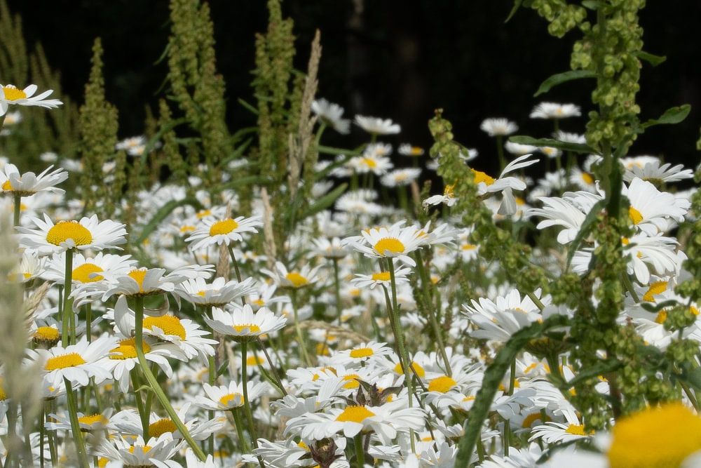 Wilde witte bloemen velden. Witte bloemen met gele harten.