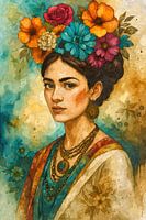 Dit expressieve portret toont een vrouw met een prachtige kroon van hibiscus-, rozen- en cosmosbloemen. Haar gouden juwelen en sierlijke kledingstukken smelten samen met de aquarelachtige achtergrond om een sensueel kunstwerk te creëren. De getextureerde compositie straalt culturele diepgang, vrouwelijke kracht en artistieke elegantie…