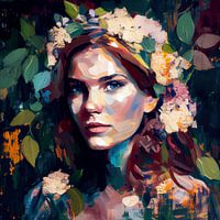 Paletmes portret van een vrouw omringd door bloemen en planten.