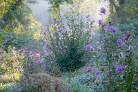 bloementuin op het einde van de zomer, waar de ochtendzon schijnt over de bloemen, die in verschillende kleuren stralen