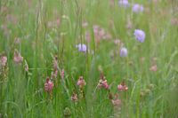 Bloemenweide in het voorjaar met bloeiende klaver en grassen en heiligbeen.