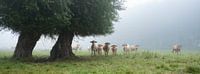 Koop dit koeien kunstwerk blonde d'aquitaine koeien in mistig weiland met twee wilgen in Frankrijk vlakbij de seine ten westen van Parijs. van anton havelaar op canvas, aluminium dibond, (ingelijste) fotoprint, behang en ArtFrame, op maat geprint in Fine-Art kwaliteit.