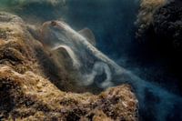 Deze foto van een wegzwemmende blue-spotted Stingray is bij toeval genomen. Het dier lag verscholen in het zand en toen ik voorbij snorkelde stoof hij ineens weg. Ik kon in een reflex deze foto maken. Hij is mysterieus door het zand wat in de beweging van zijn vinnen meegolft. Foto is genomen in Marsa Alam ter hoogte van hotel Three…