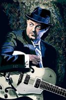 Een digitaal schilderij van een bluesmuzikant in pak met hoed en een prachtige gitaar. Door het werken met een beperkt kleurpalet en veel donkere tinten heeft kunstenaar Bert-Jan de Wagenaar een prachtig sfeervol schilderij gemaakt, passend bij elk interieur.