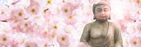 japanse kersenbloesem met buddha in de lente, symbool voor het begin van de lente in azië, sakura genaamd, lentefeest in japan, roze geurende bloemencape op de achtergrond