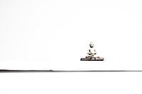 Een straatfoto van een Boeddhabeeld met een ivoorwitte achtergrond. Deze combinatie heeft een rustgevende sfeer.