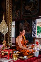 Ik liep deze tempel in de stad Pakse in Laos binnen en deze monnik voerde verschillende rituelen uit. Bij een van deze rituelen gaf een vrouw hem een doek die vervolgens werd aangestoken. De vlam wakkerde een lange tijd.