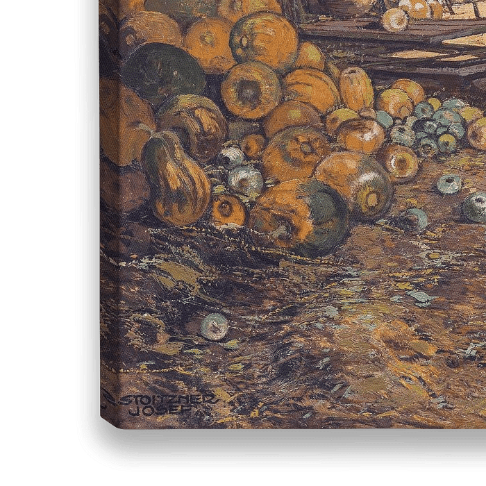 Koop dit moderne kunstwerk boerderij met pompoenen, Burgenland, JOSEF STOITZNER, ca 1935 van Atelier Liesjes op canvas, aluminium dibond, (ingelijste) fotoprint, behang en ArtFrame, op maat geprint in Fine-Art kwaliteit.