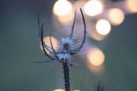 close up van een afgebroken distel bloem, met een donkere bokeh achtergrond
