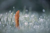 close up van een bruin herfstblad in het natte gras, met het zonlicht op de druppeltjes, wat voor een mooi bokeh effect zorgt