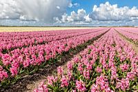 Een Hollands lente landschap met een bollenveld met bloeiende hyacinten en blauwe lucht met wolken
