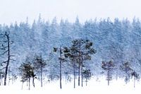 een eenvoudig boslandschap in de sneeuw in Noord Zweden. De donkere bomen op de voorgrond zorgen voor diepte in de foto, waardoor een bijzonder beeld ontstaat.