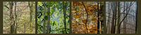 Collage van de vier seizoenen in het bos met een rustige groene achtergrond. Impressie van bomen in lente, zomer, herfst en winter. In een zwart kader. Ik hou van bomen ze zijn in elk seizoen mooi.De verschillende foto's bestaan steeds uit twee lagen die over elkaar zijn gelegd in de computer.