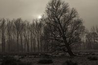 de zon priemt door de mist boven de bomen in het landschap ten zuiden van den bosch. dooibroek heet het hier.