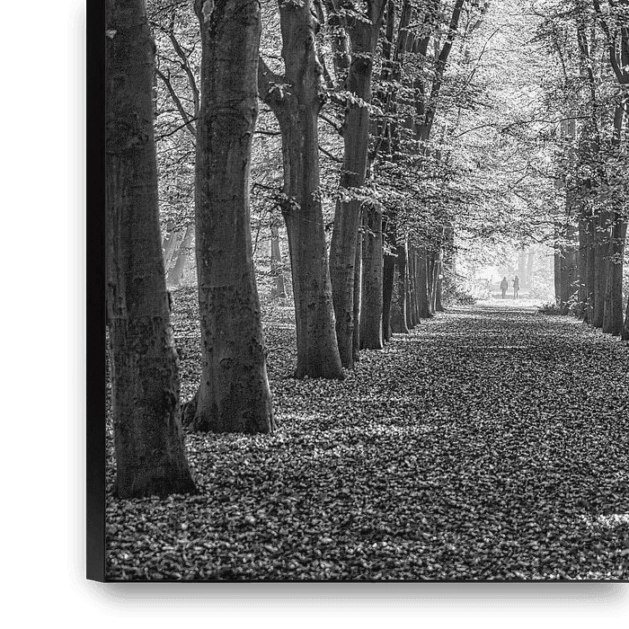bomenlaan in de herfst in het beroemde bos van bergen nh. uitgevoerd in stemmig zwart wit met twee wandelaars in de verte