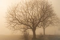 Boom in de mist. Doordat de zon bijna doorbreekt krijgt de foto een prachtige zacht oranje tint. De achtergrond wordt door de mist verhuld, wat het beeld heel rustig maakt. Perfect voor in een slaap- of wachtkamer.