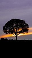 Een silhouet van een boom met op de achtergrond de zonsondergang.