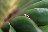 Het kikkertje is zo'n 2,5 cm groot. De kleuren van het kikkertje passen perfect bij die van de plant; er is zowel een mooi contrast met het groen, als een overeenkomst met de stekels van de plant.
