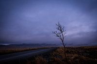 Het ruige landschap van IJsland op zijn best. De ochtend is guur en koud. De zon komt net op, de kleuren van de wolken en de mist kleuren paars en blauw. De verlaten weg gaat nergens heen, de grassen zijn verdord en waaien in de ijzige wind en geven nog wat meer kleur aan deze foto.