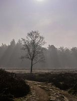 landschap op de Wolfhezerheide in Doorwerth, waar een boompje staat te schitteren onder de zonnestralen van een prachtige winterochtend