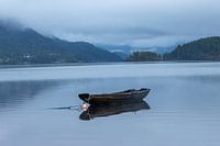 rijden door zuid Noorwegen door de fjorden kan je heel vaak zo een uitzicht zien met een lege boot op een stille water.