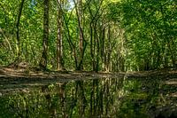 Al wandelend door het bos stuit ik op een enorme plas op het bospad. Natte voeten en de schoenen onder de blubber, maar.... ik heb wat ik hebben wilde een weerspiegeling van de bomen in het bos.