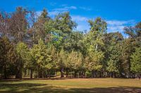 bomen in de herfst met goudkleur en bruin en groene bladeren