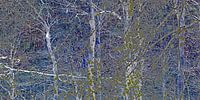 Digitaal bewerkte foto van stammen in een bos, de bewerkingen maken van het bos een kleurrijk sprookjesbos uit een fantasiewereld of een droomwereld.