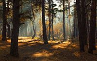 Ochtend in het bos overspoeld met zonlicht. De stralen van de zon breken door de takken van de bomen. Mooi weer.