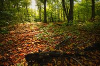 Bos in de herfst met gefilterd zonlicht door de bomen