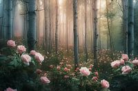 digitaal fictief bos met bloemen en dramatisch licht