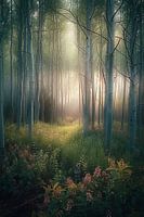 digitaal fictief bos met bloemen en dramatisch licht