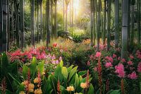 digitaal fictief bos met bloemen en dramatisch licht