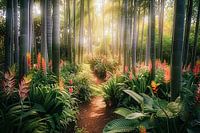 digitaal fictief bos met bloemen en dramatisch licht
